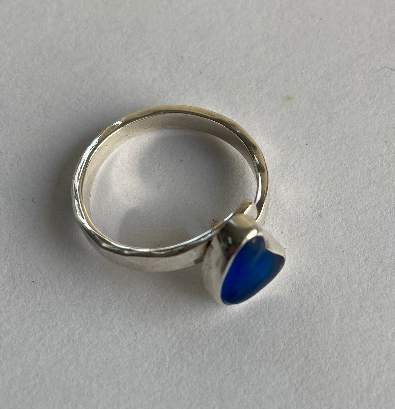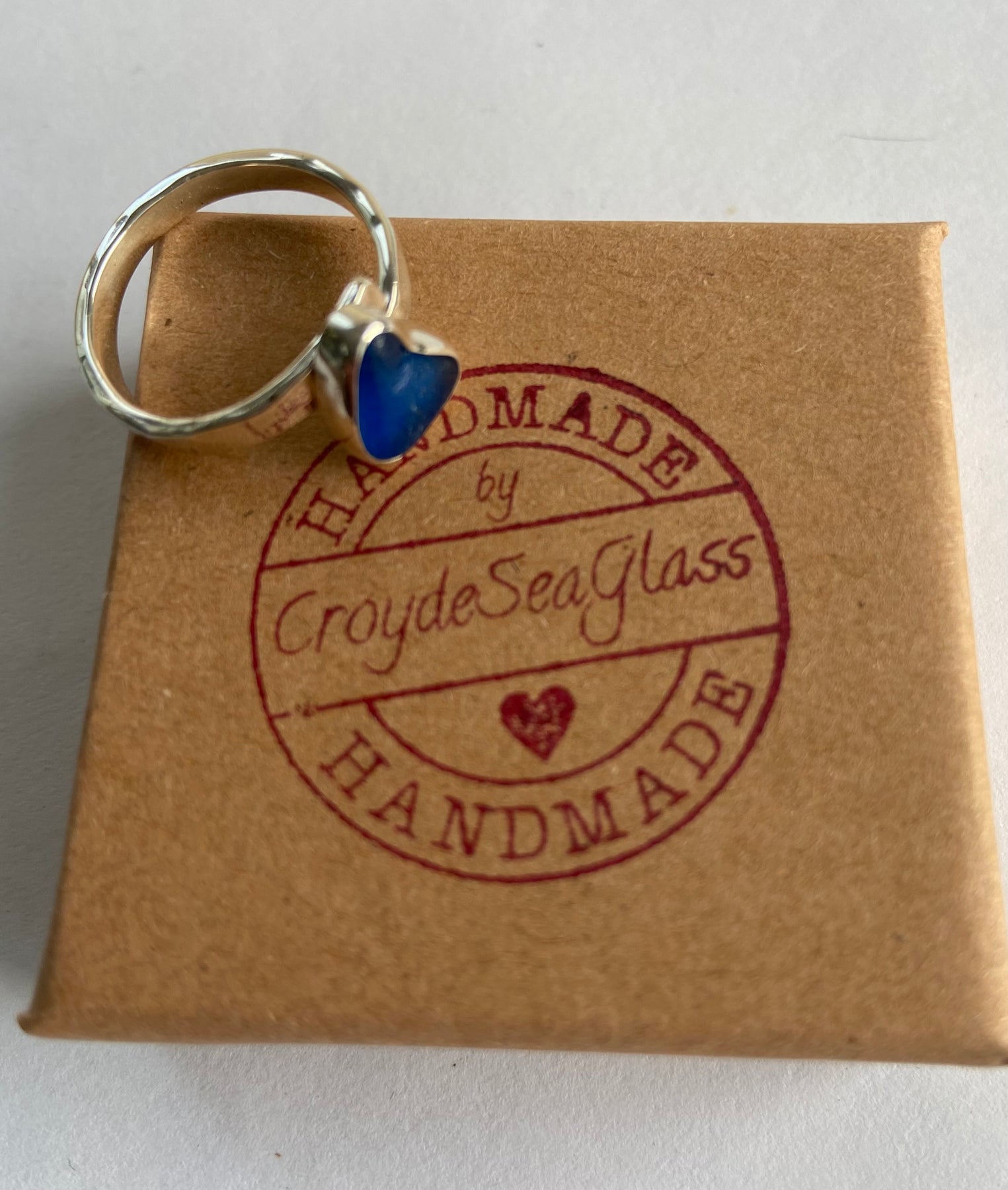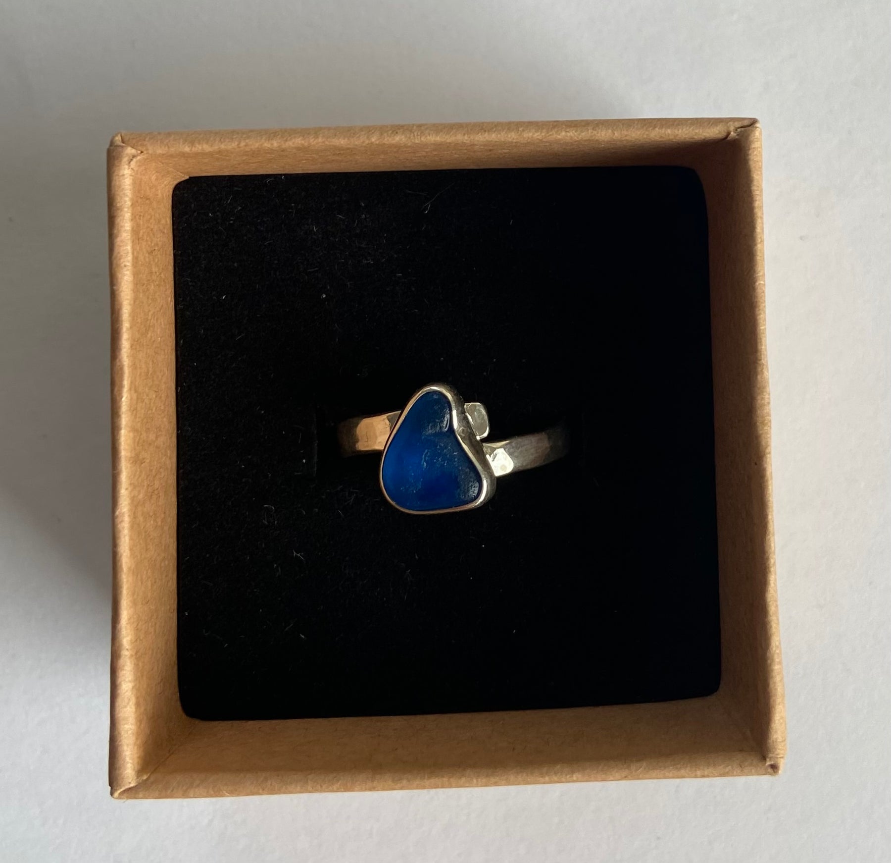 A beautiful, blue, heart shaped piece of seaglass, sits in its sterling silver bezel. It has a slim, adjustable hammered ring. This is another sliver of seaglass, found on our favourite North Devon seaglass beach. Blue glass most commonly comes from medicine or perfume bottles and this little bit has been rolling around on the beach, tumbling in the waves for a while.