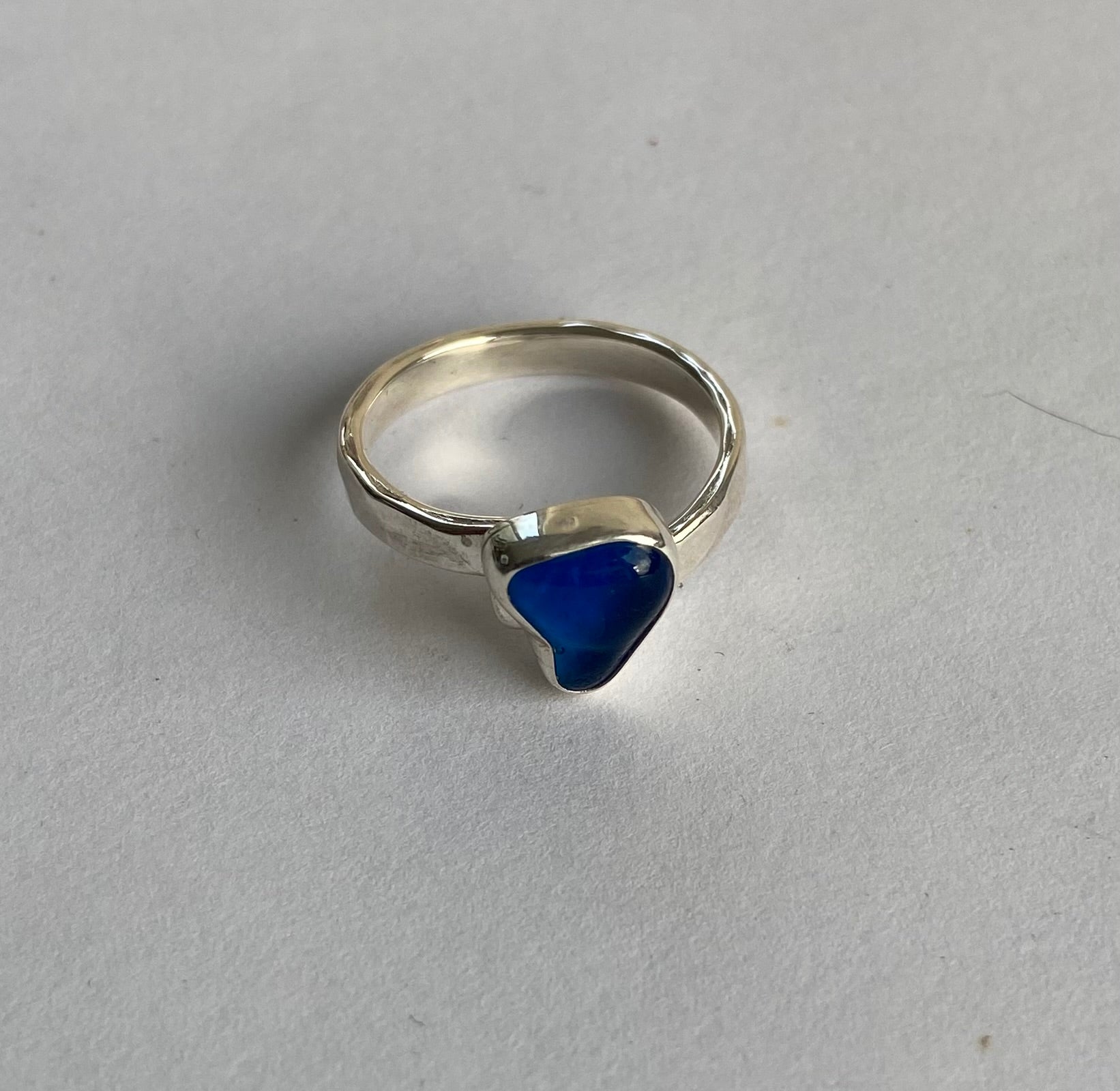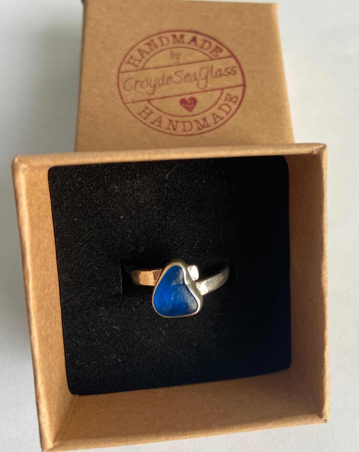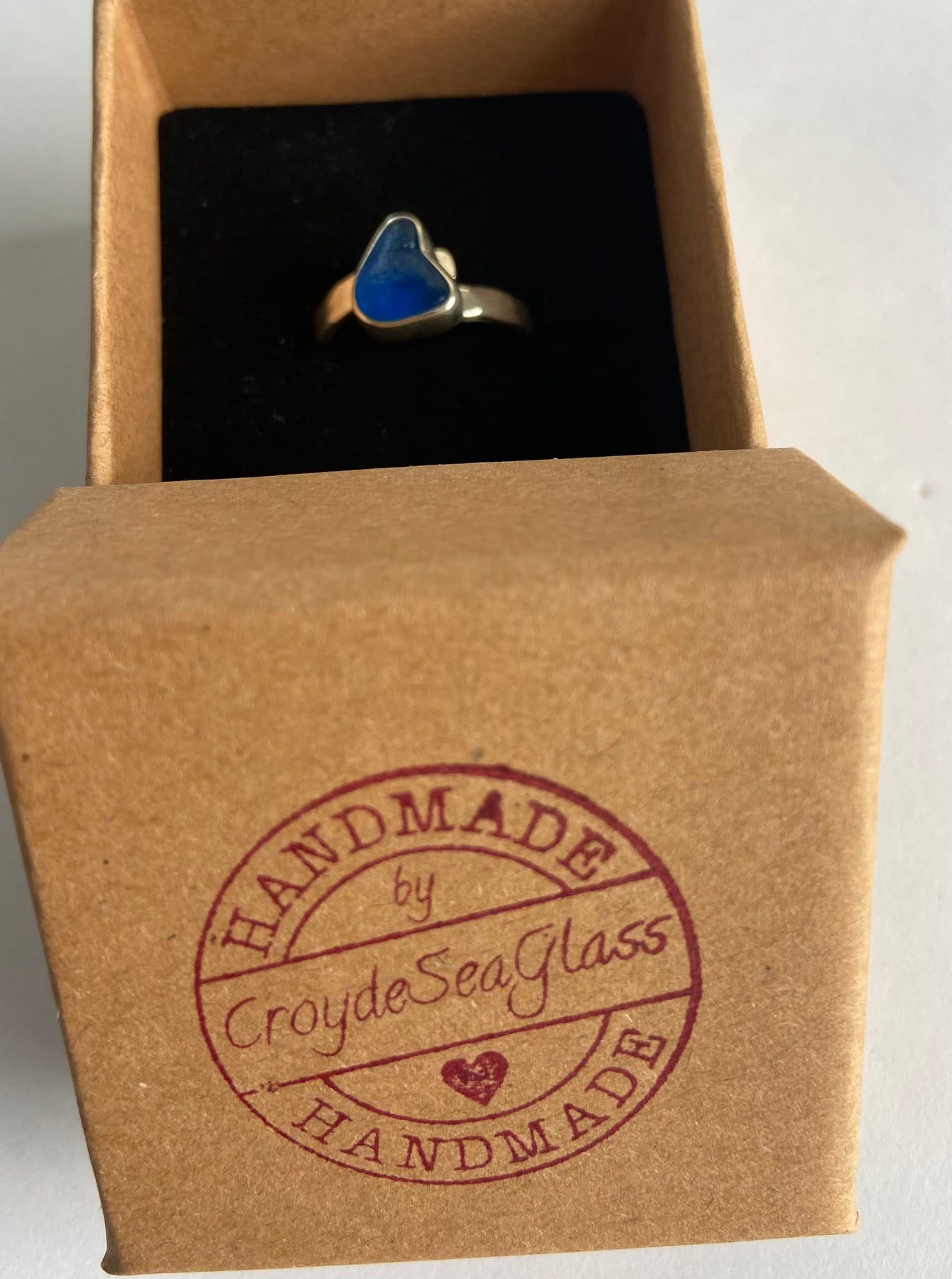 A beautiful, blue, heart shaped piece of seaglass, sits in its sterling silver bezel. It has a slim, adjustable hammered ring. This is another sliver of seaglass, found on our favourite North Devon seaglass beach. Blue glass most commonly comes from medicine or perfume bottles and this little bit has been rolling around on the beach, tumbling in the waves for a while.