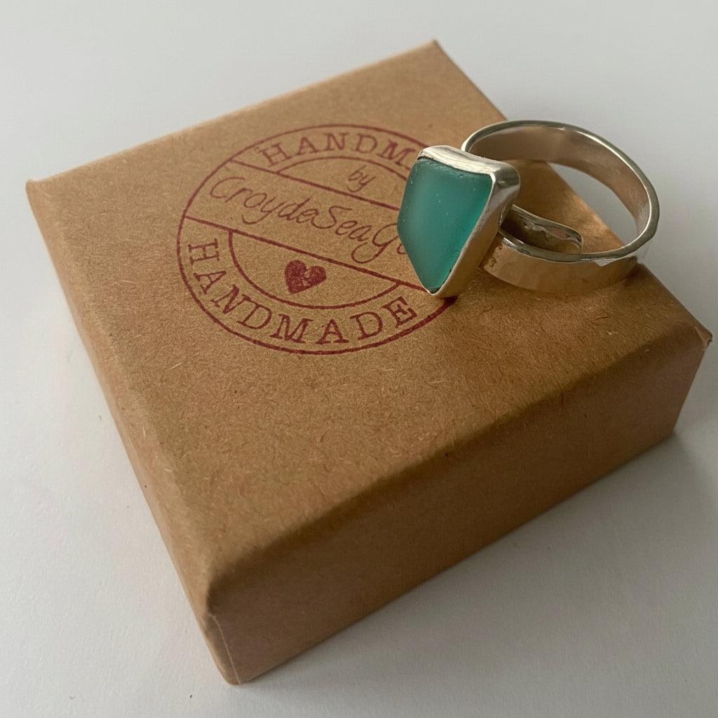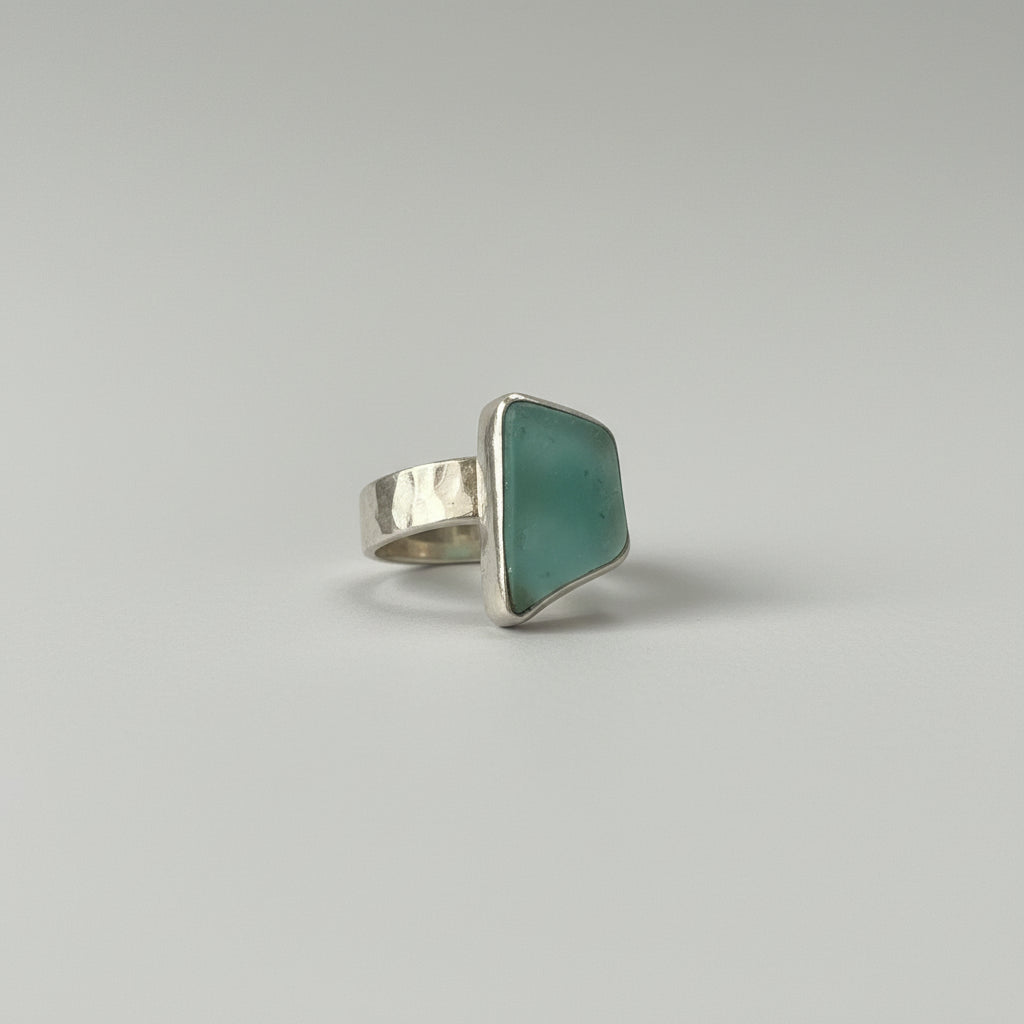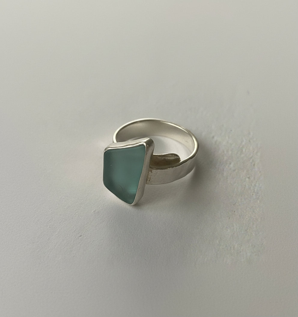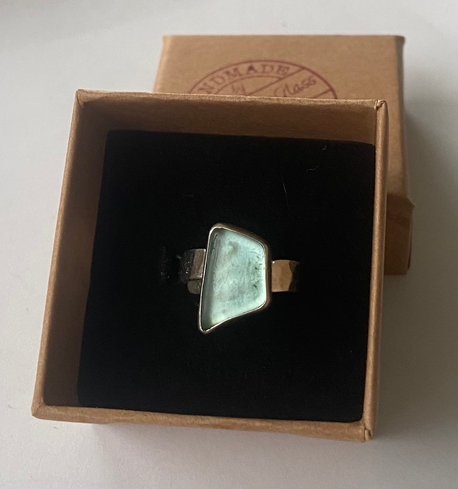 It is misty, pale silver, aquamarine in colour and possibly originated from a soda water bottle, or a glass tumbler. It is secured in a sterling silver bezel, which is attached to a fine hammered band.