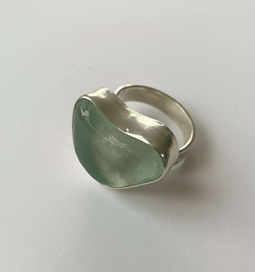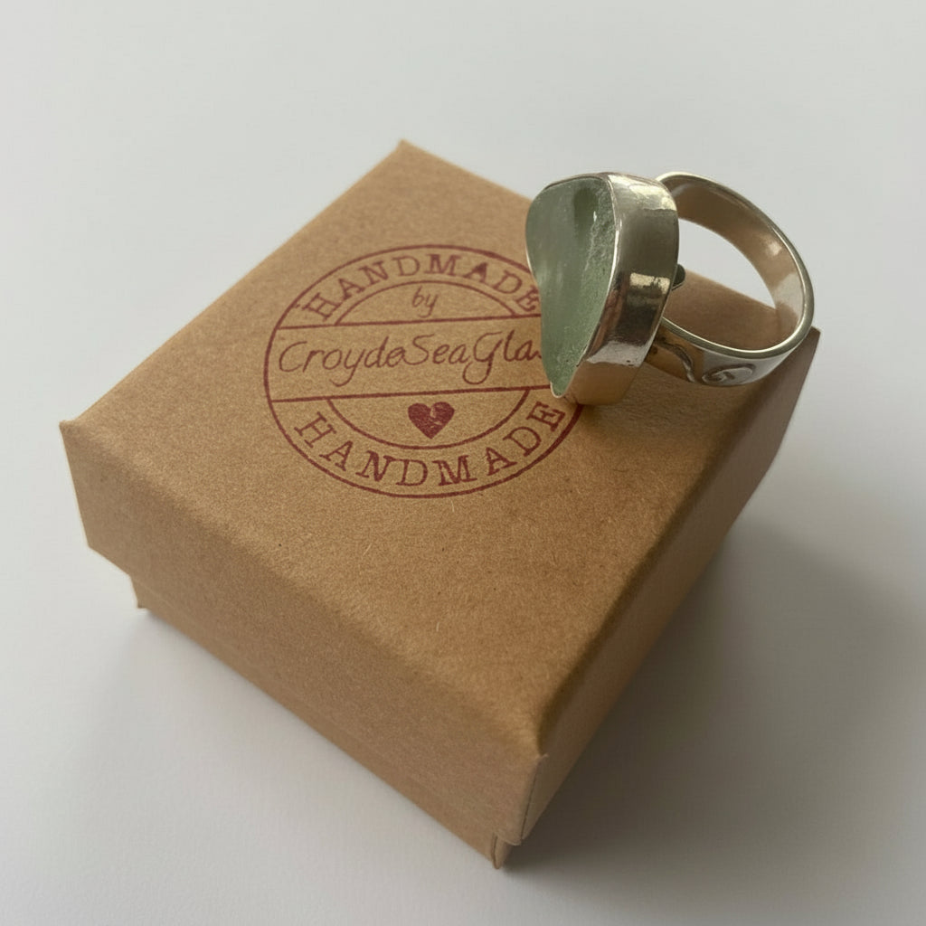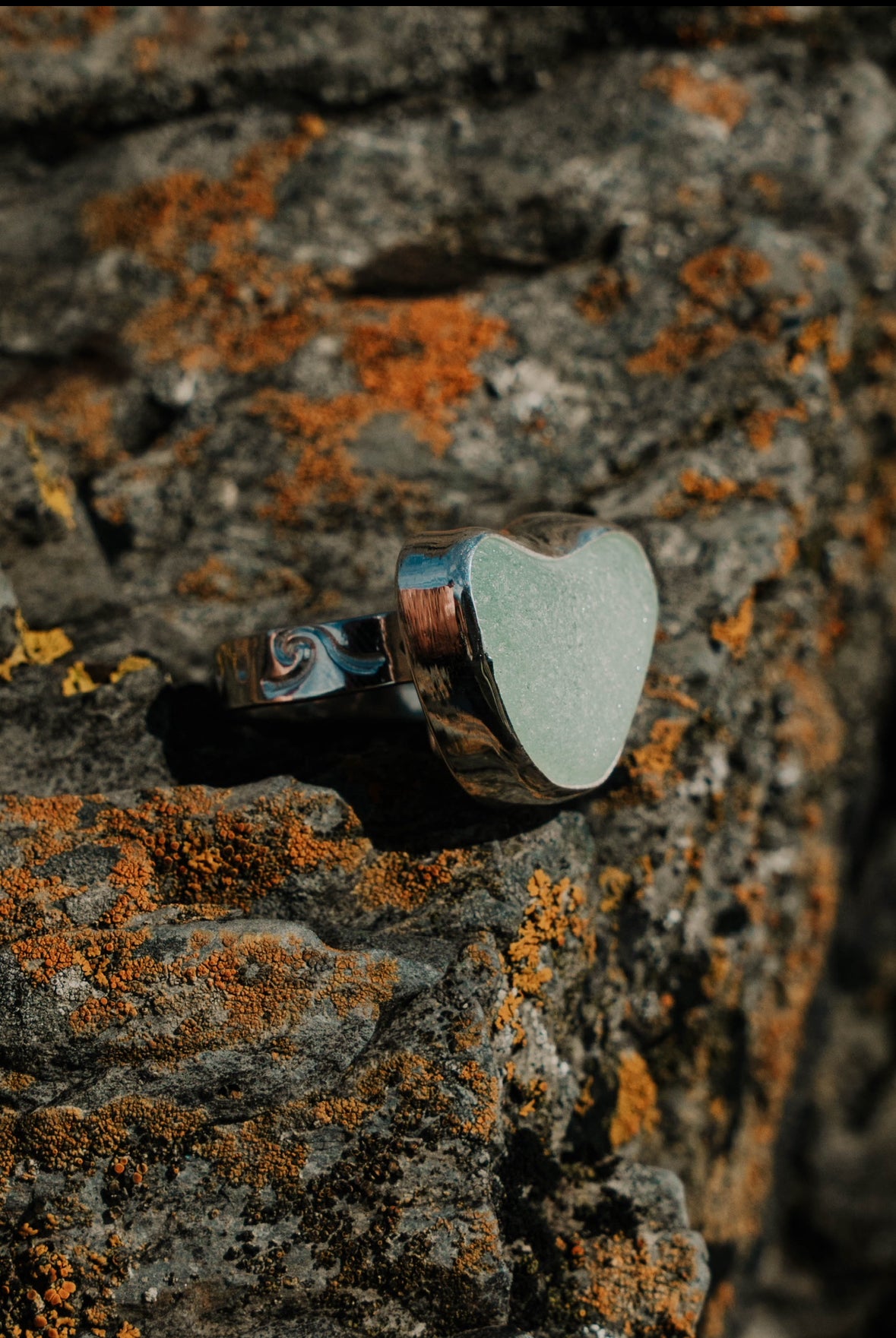 It was picked up from a North Devon beach and placed in a solid, sterling silver bezel. This has been attached to a wave engraved adjustable band, to make a stunning ring.