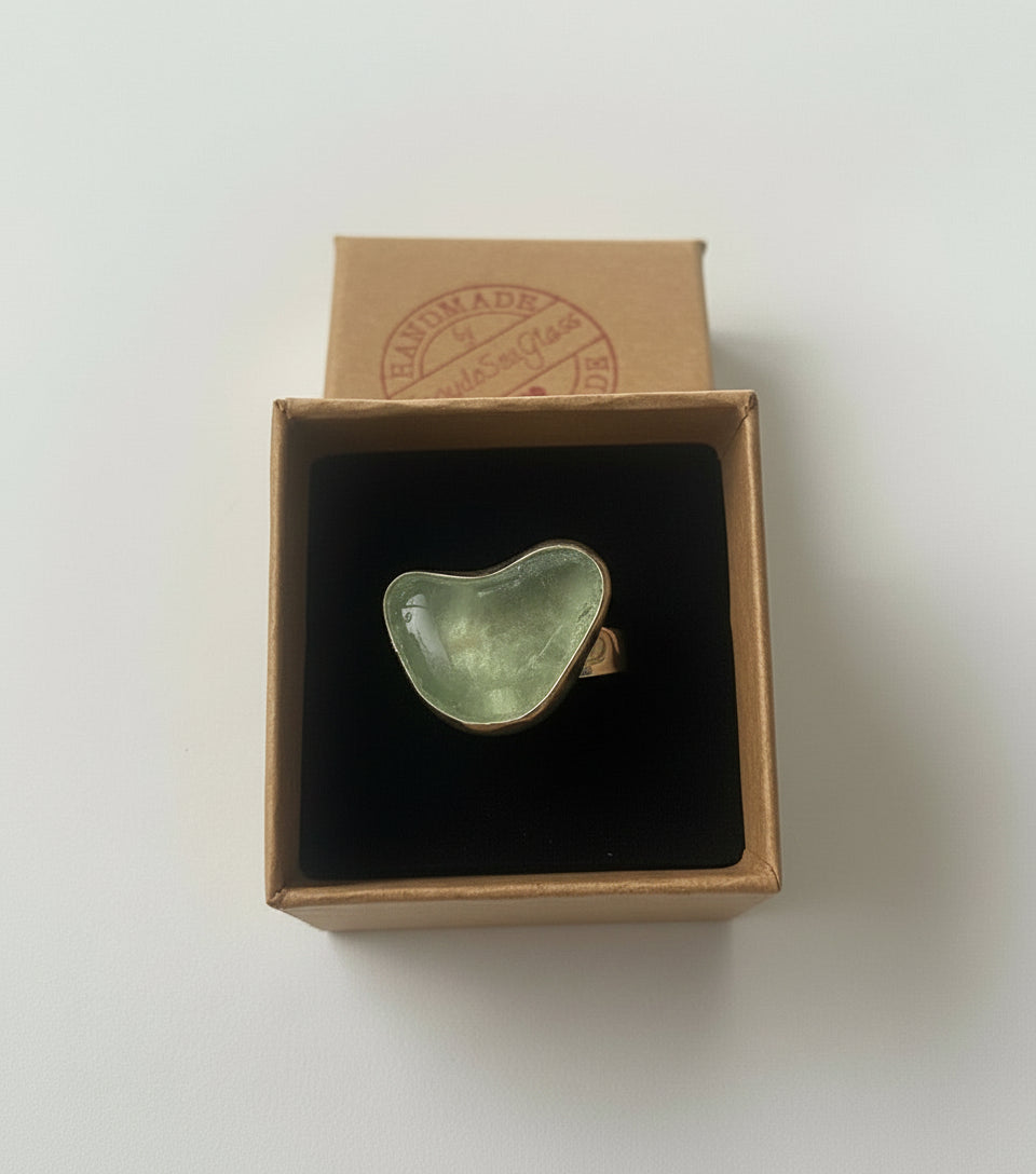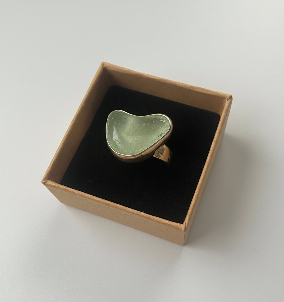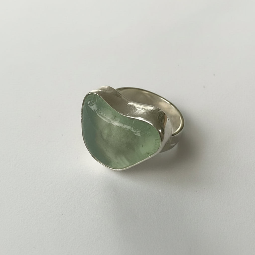 It was picked up from a North Devon beach and placed in a solid, sterling silver bezel. This has been attached to a wave engraved adjustable band, to make a stunning ring.