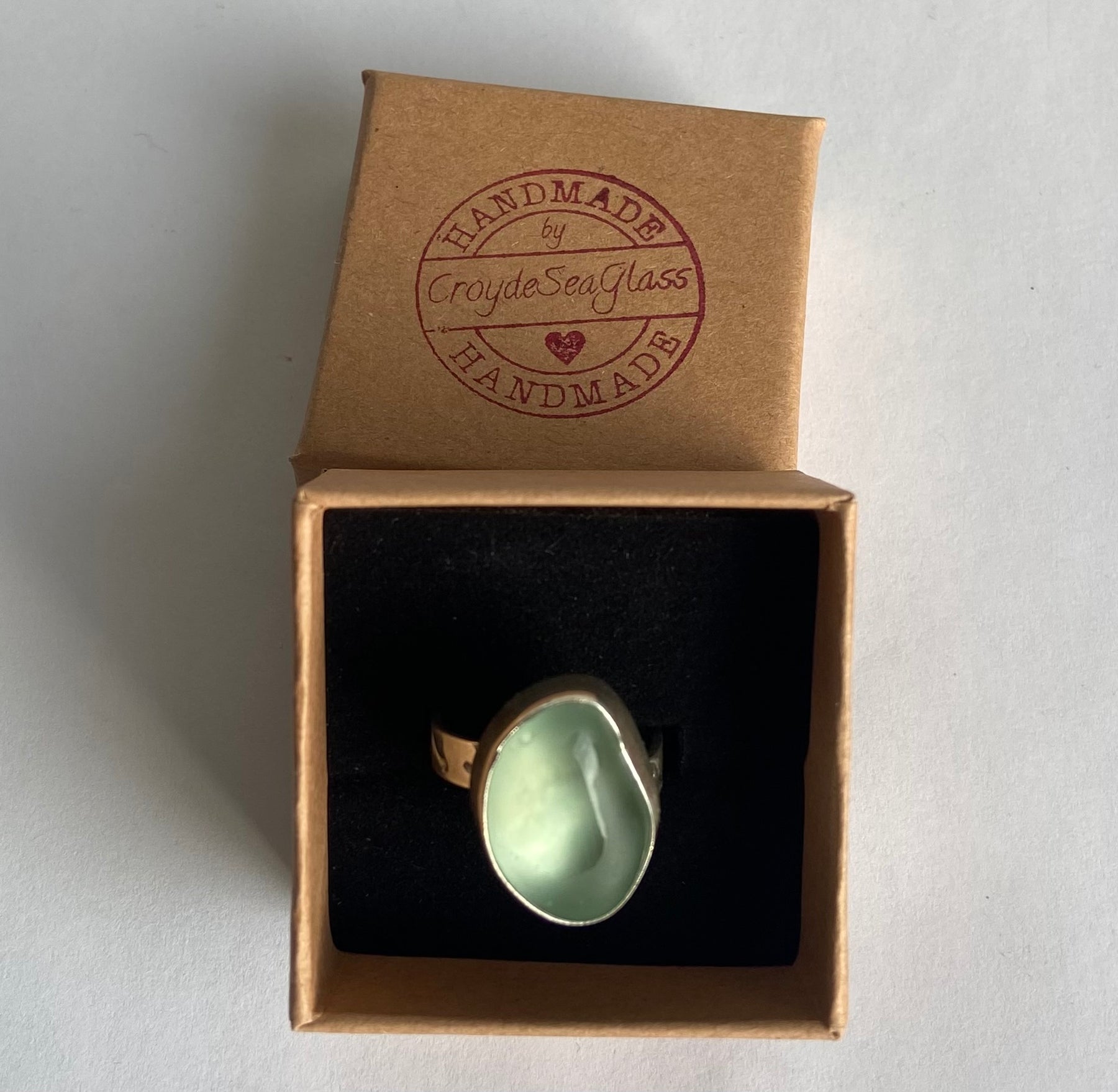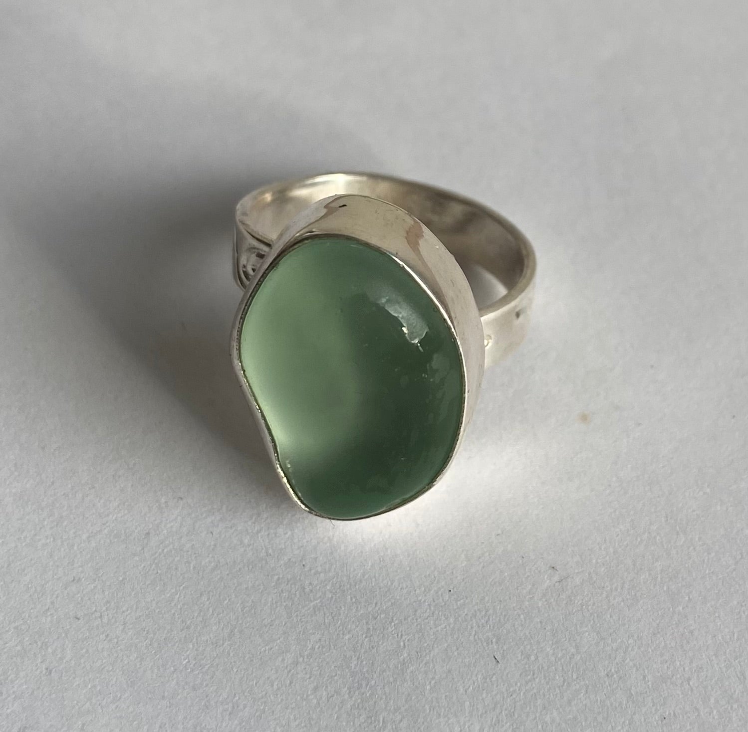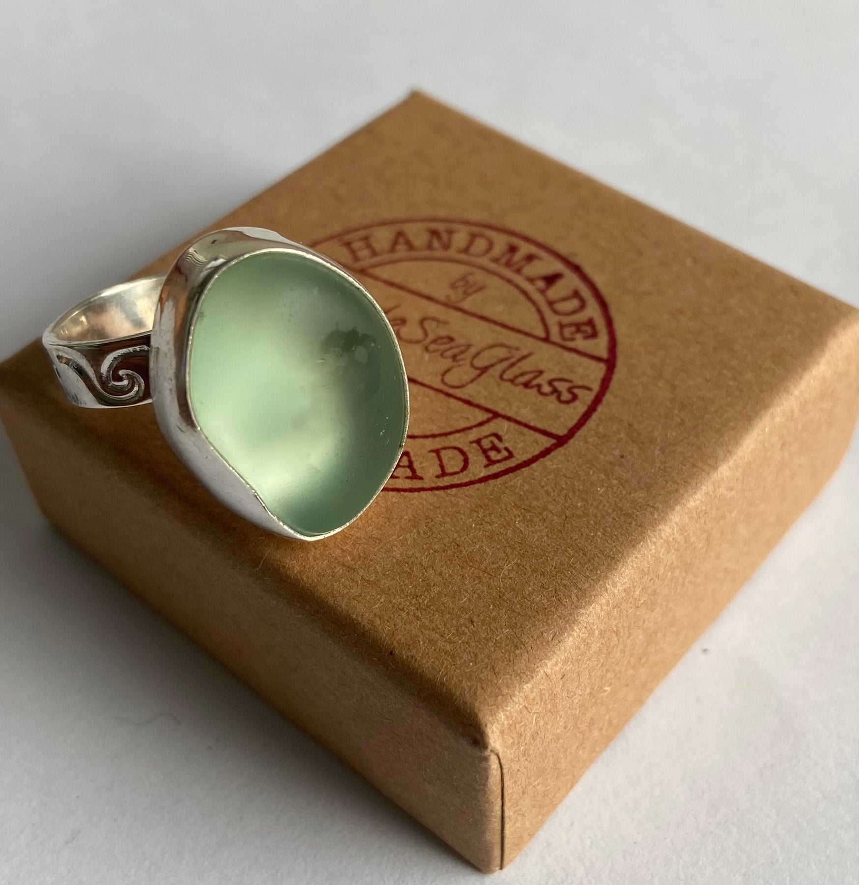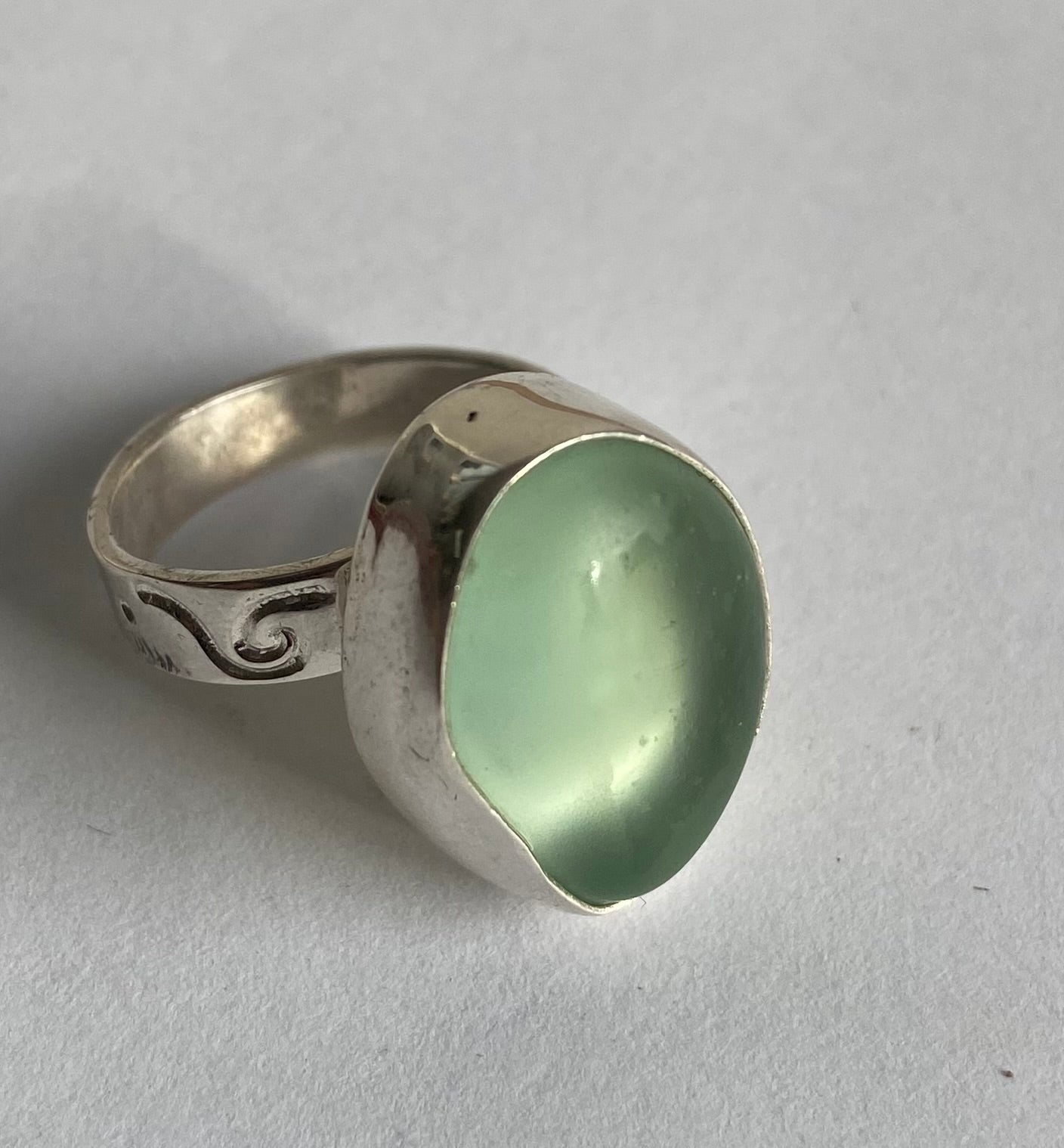 A beautiful and chunky piece of North Devon seaglass is held in a sterling silver bezel and attached to a wave engraved ring. This misted palette of glass was often used in 20th century soda or mineral water bottles. 1cm width x 1.5cm length x 1cm height.